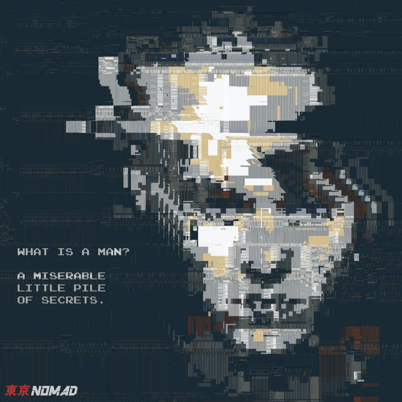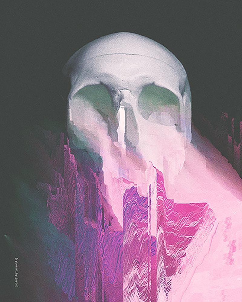 I love the ways the gradients melt into each other. The muted, dark grays of the sky suddenly exploding into these green, blues, purples and pinks and back again, which creates this rugged mountain, on top which sits this ginormous skull, like some kind of supervillains lair. The way in which the glitches are blended makes me feel like the skull is vomiting up the earth, as though the skull is giving birth to the world into the blackness of the void. "On the first day, the Giant Skull God vommed up the land"