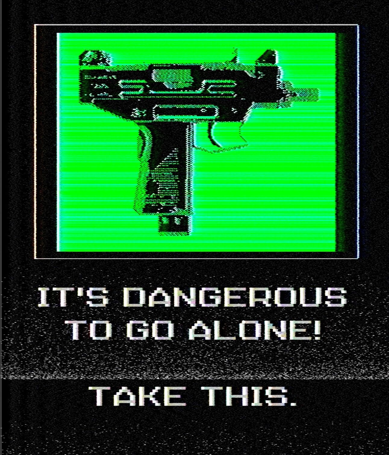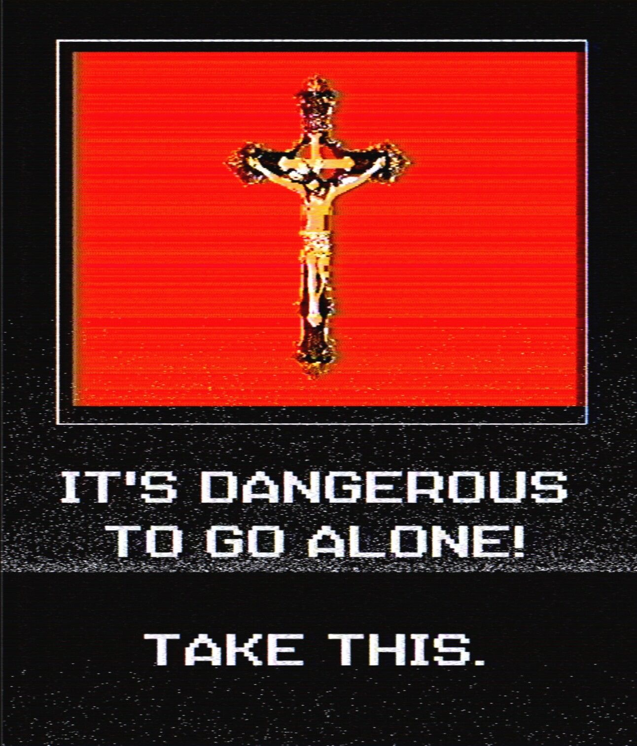 Two of the pieces are from my Protection series, which show a selection of items displayed alongside the text "It's dangerous to go alone, take this" from the classic NES game, The Legend of Zelda. In the original game, these words are spoken by a mysterious old man as he passes a sword to our hero at the beginning of his adventure. We're all the 'hero' of our own stories whether or not those stories are good, bad or mundane. I reimagined this scene with different items such as a sandwich and thermos, depression medication, an uzi, and a crucifix so that these scenes can be applied to different protagonists.