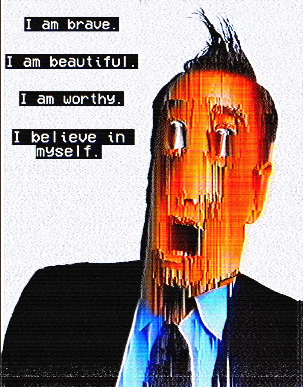 Positive Affirmations is part of a series I did where I took these motivational phrases that can be seen in different places, from the LinkedIn business variety, to the Pinterest Girl Boss ' variant, and placed them alongside these distorted, uncanny valley-esque characters. The contrast of these statements next to the horrifying creatures is meant to highlight the hollowness of the statements, as cheap as the plastic frame housing a "live, laugh, love" print.