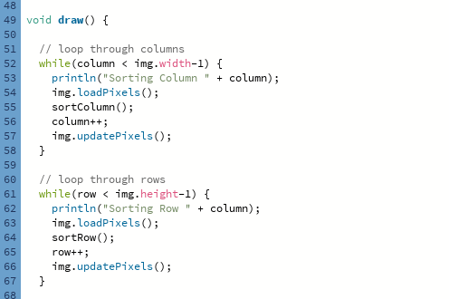 Next thing you can do is play around with where on the image the algorithm starts performing the sorting from. By default, the algorithm is set up to perform the sorting from row and column 0, which means it does the sorting throughout the whole image. But if you change the number 0 to something else, it will only start sorting once it reaches that number row or column