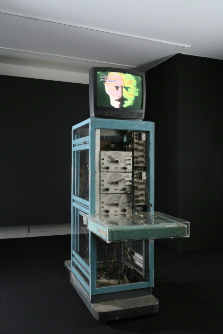 All of the videos on the monitors were corrupted with a video synthesizer that Paik and his technical partner, Shuya Abe, built. This video synthesizer would have been one of the first video synthesizers ever built and was the size of a fridge.