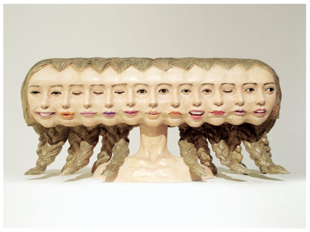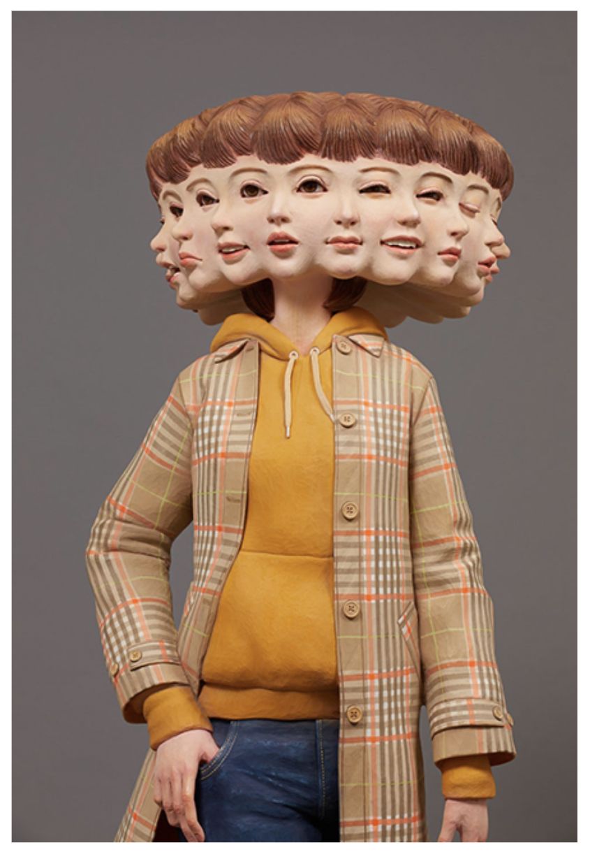 Take, for instance, his Caprice series, named after the word meaning a sudden and unaccountable change of mood or behavior. These works feature carvings of people who have sprouted multiple faces, each simultaneously expressing a different emotion.