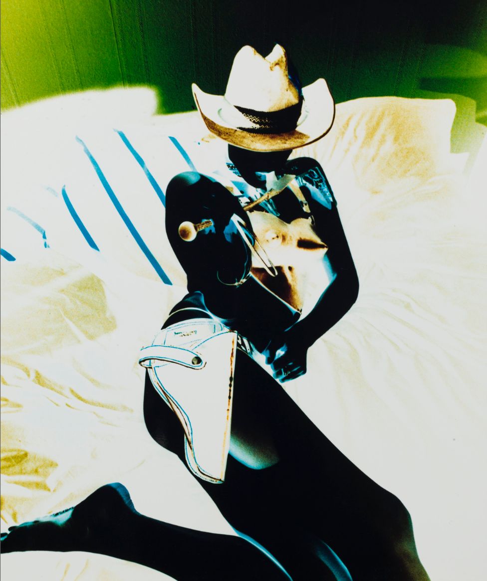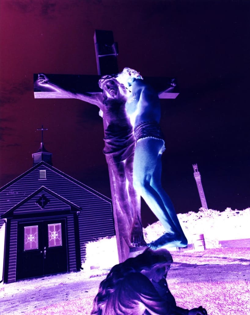 A lot of the photos depict juxtapositions of queer models set against Christian right motifs such as churches, crucifixes, cowboys and the KKK. The different colours giving a further surrealness to the contrasting themes.